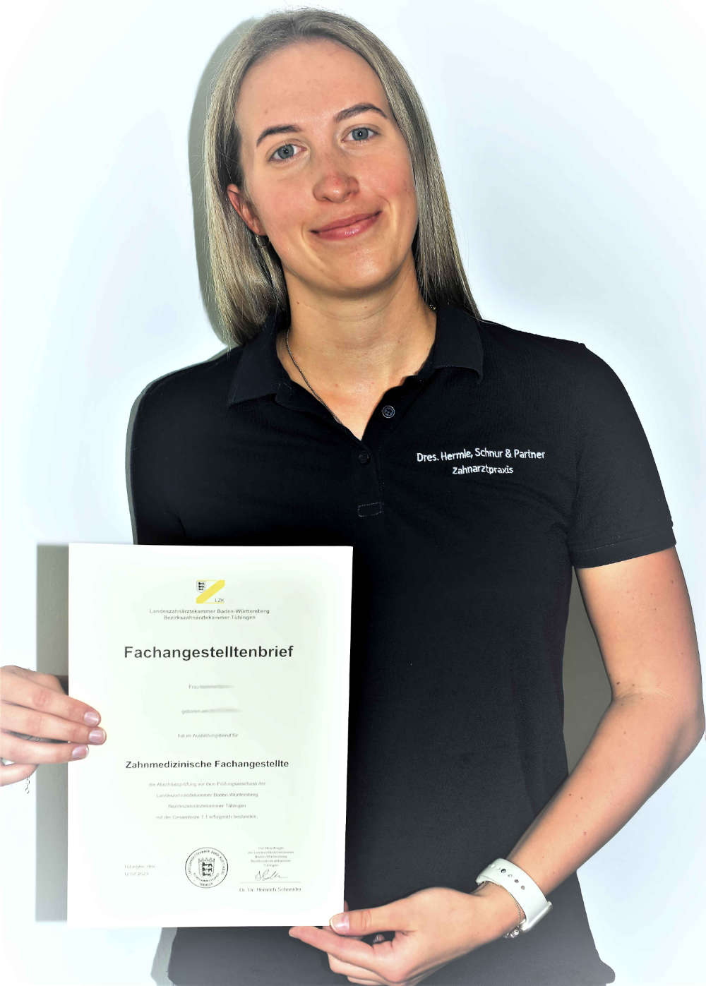Mit viel Ehrgeiz und Talent hat sie es zur deutschen Meisterin in der Rhythmischen Sportgymnastik gebracht und mit Ehrgeiz und Talent hat sie als Jahrgangsbeste in Baden–Württemberg die Ausbildung zur ZFA absolviert. Mit der Gesamtnote von 1,1 erhält Helena N. zudem eine Stipendium der Landeszahnärztekammer im Wert von 8000 €, das sie für Fort- und Weiterbildungen abrufen darf. Zu dieser Leistung gratulieren wir ganz herzlich! Außerdem freuen wir uns, dass sich Helena nach ihrer Ausbildung weiter mit unserer Praxis verbunden fühlt und ihr Können in unserer Praxis und an den Patienten Anwendung findet.